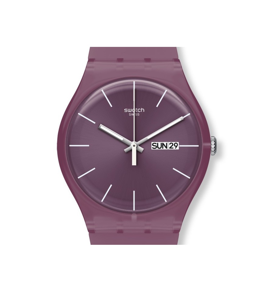 Acesta este un ceas unisex fabricat de catre vestita firma elvetiana Swatch. Face parte din seria New Gent. Carcasa este din plastic. Bratara este din silicon. Cadranul este rotund. Intregul ceas are culoarea prunei. Afiseaza ziua si data. Rezista la apa. Este un ceas placut si modern.