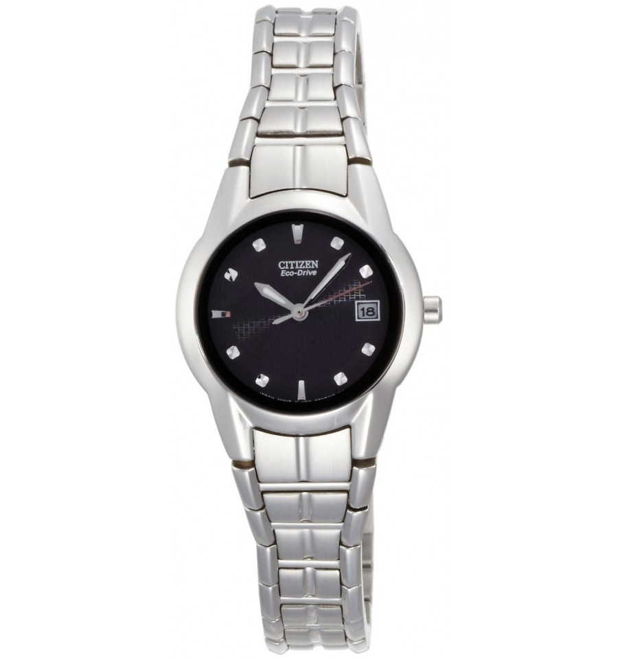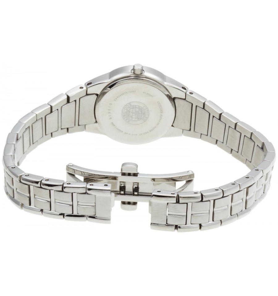 Acest ceas de mana de dama, Dress Dracelet EW1410-50E, produs de renumitul producator japonez Citizen, are carcasa si bratara din otel inoxdabil alb, cadranul negru cu aratator si indicator argintiu, iar sistemul de inchidere este de tip deployant. Geamul este din cristal mineral rezistent la zgarieturi. Ceasul converteste orice sursa de lumina fie naturala, fie artificiala, in energie utilizabila prin tehnologia Eco-Drive.