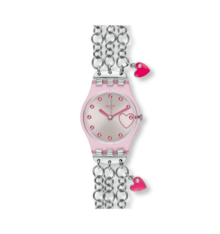 Acest ceas de mana de dama, Charming Pink LP129G, produs de renumitul Swatch Watches, are carcasa din plastic roz transparent, cadranul sclipitor pe care sunt aplicate cristale roz si, bratara din otel inoxidabil argintiu format din trei lantisoare cu doua inimioare roz.