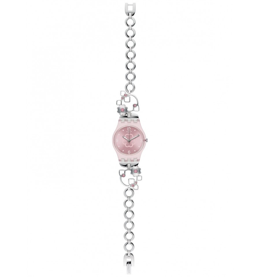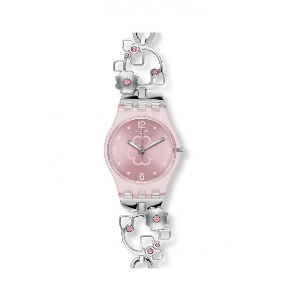 Acest ceas de mana de dama, Silver Flower LP130G, produs de renumitul Swatch Watches, are carcasa din plastic de culoare roz pal transparent, cadranul roz, geamul din cristal mineral, iar bratara este din otel inoxidabil argintiu pe care sunt aplicate cristale sferice de culoare roz.