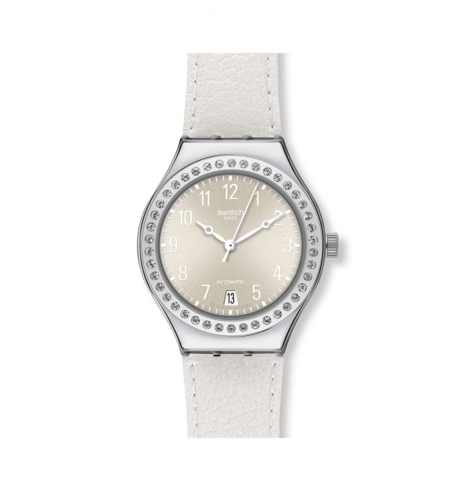 Acest ceas de mana de dama, Whitematic YAS404, produs de renumitul Swatch Watches, are carcasa din otel inoxidabil argintiu, cadranul auriu-crem inconjurat de cristale sferice aplicate pe bezel, curea din piele naturala de culoare alba, inchisa prin catarama. Mecanismul este automatic.