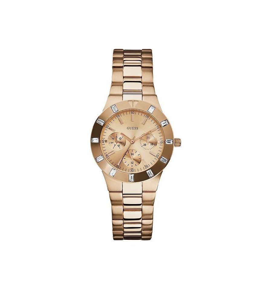 Ceasul de mana dama original Guess Watches U15503L1 are carcasa si bratara din otel inoxidabil auriu, cadranul auriu, geamul din cristal mineral rezistent la zgarieturi, iar bezelul impodobit cu cristale. Mecanismul ceasului este pe baza de quartz. Ceasul vine complet cu cutie, garantie si manual.