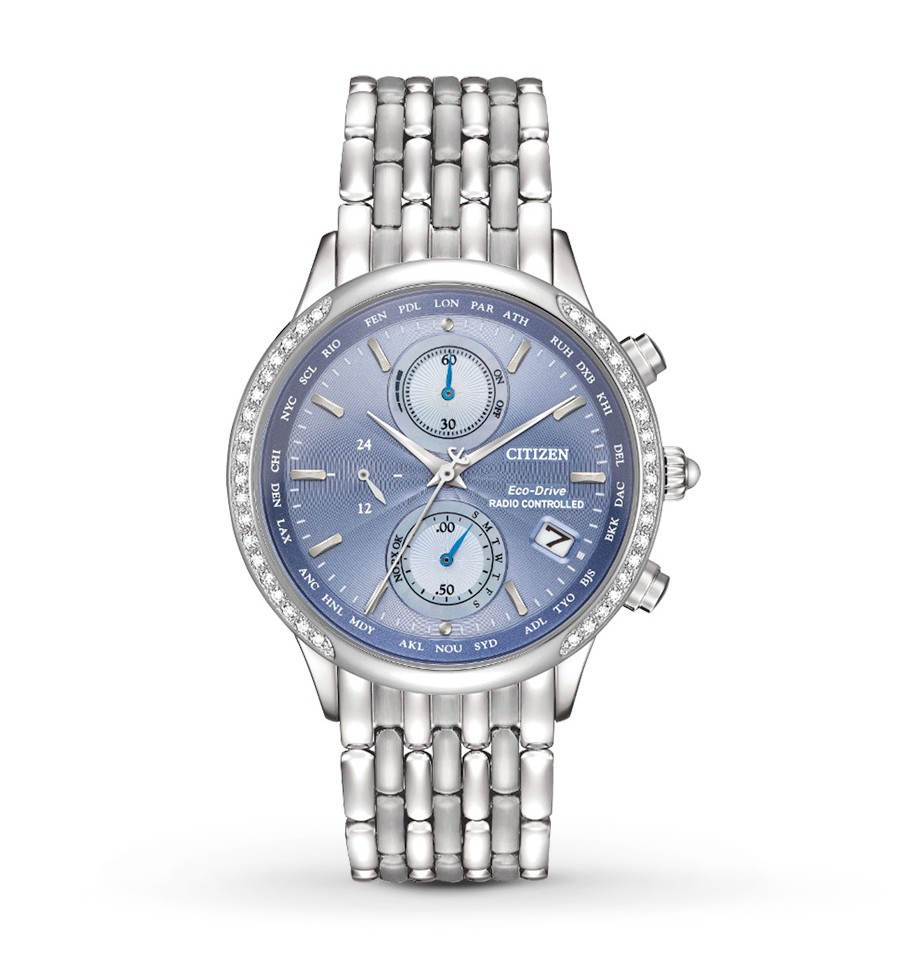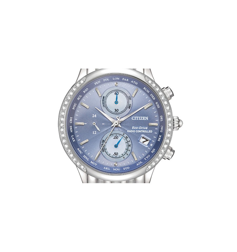 Ceasul FC5000-51L marca Citizen, face parte din gama World Chronograph, cu un design special creat pentru doamnele care sunt frecvent in deplasari, fiind un ceas atomic care regleaza automat ora in 26 de zone geografice diferite, mentinandu-va la timp dar si la moda, indiferent de zona in care calatoriti. Ceasul are o rama decorata cu diamante, cronograf de pana la 60 de minute, calendar perpetuu, format al orei 12/24 si functie de afisare zi si data.