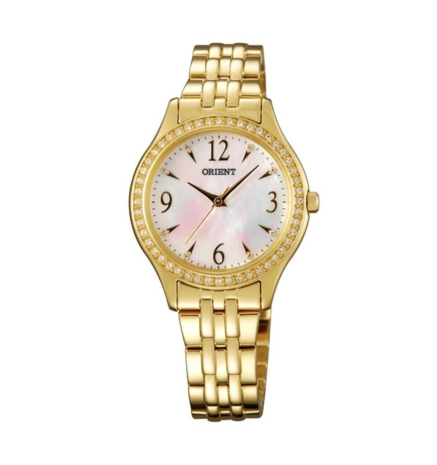 Ceas de mana auriu de dama original orient clasic quartz lady model FQC10003W0 este un ceas finut, elegant de 30mm cu bratara si carcasa din otel inoxidabil placat cu aur. Cadran sidef,cristale swarovski pe bezel si geam cristal mineral.Vine cu garnatie de doi ani, factura si chitanta, cutie originala si toate actele.