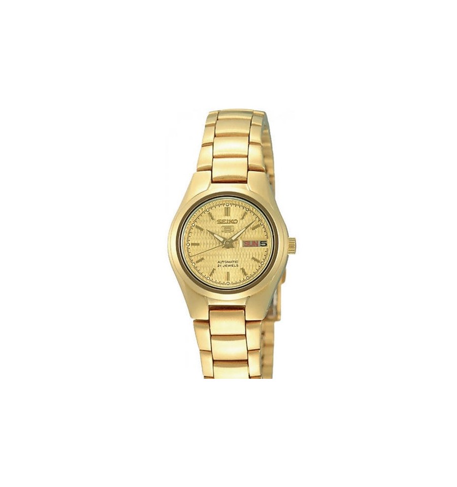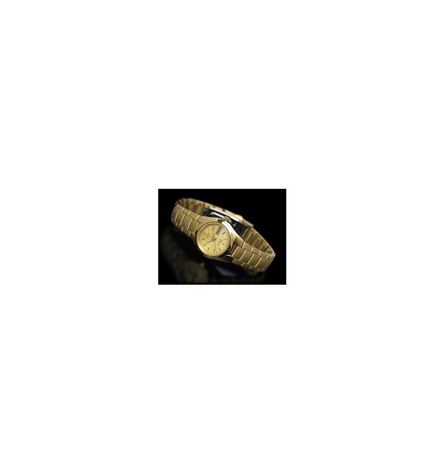 Ceas de mana dama auriu Seiko 5 automatic SYMC18K1,este un ceas analog cu design clasic de 25mm diametru cu carcasa si bratara din otel inoxidabil auriu, cadranul alb, geamul din cristal mineral hardlex, iar sistemul de inchidere de tip deployant. Mecanismul este automatic model 4207.