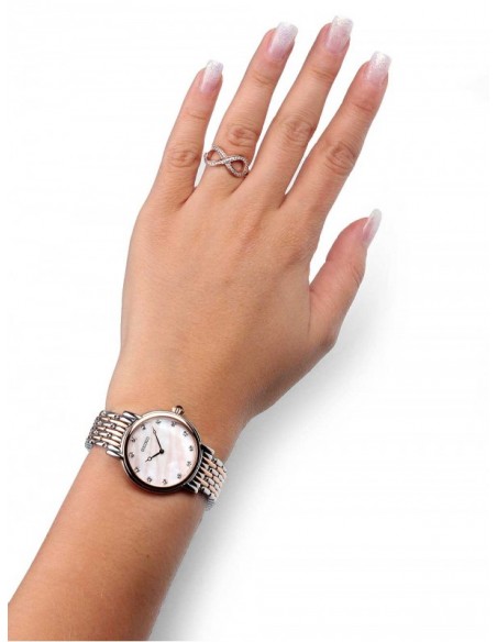 Ceas de mana dama Seiko clasic SFQ806P1 de diametru 29.4mm cu un cadran fenomenal din sidef cu pietricele swarovski. Ceasul are o combinatie prerfecta dintre auriu si argintiu.