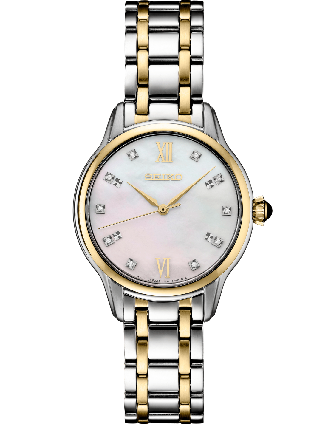 Ceas de mana dama auriu Seiko Colectia Diamonds SRZ540 cu un diametru de 29,5mm cu un cadran din sidef cu 10 diamante, geam safir cristal si mecanism quartz 7N01.
