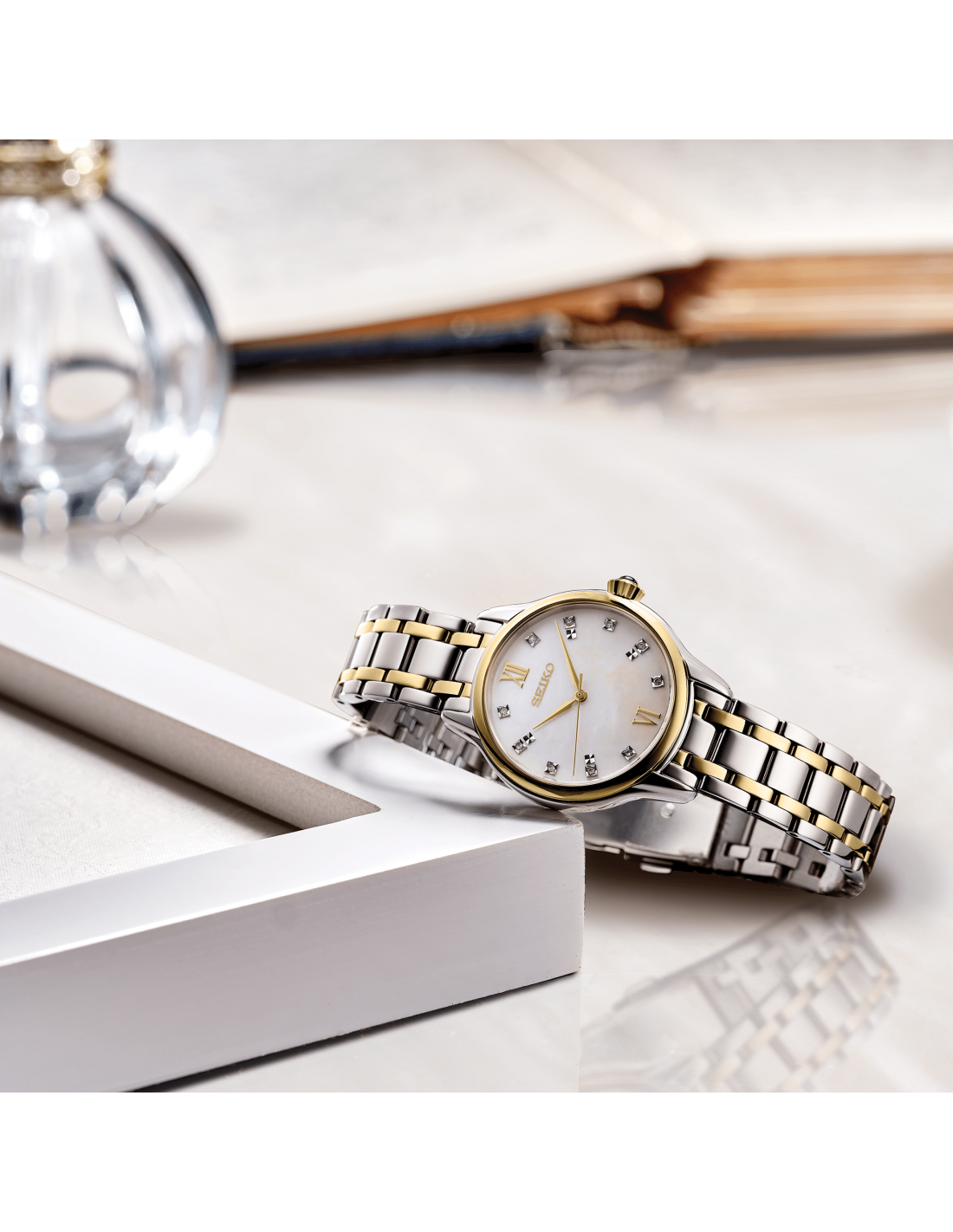 Ceas de mana dama auriu Seiko clasic SRZ502 de diametru 29mm cu un cadran augintiu cu pietricele swarovski este de o eleganta absoluta. Ceasul este din otel inoxidabil placat cu aur.