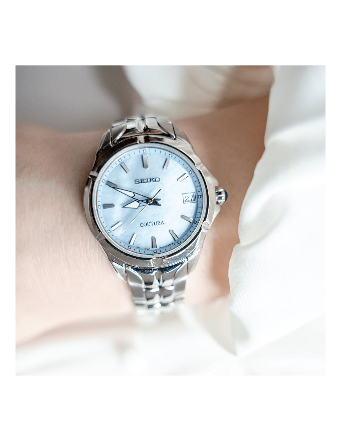 Ceas de mana dama Seiko Coutura SUR583, este un ceas quartz made in Japan de 34mm, geam safir cristal si cadran sidef albastru, cu mecanism japonez 6N42.
