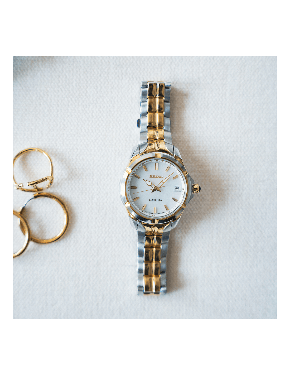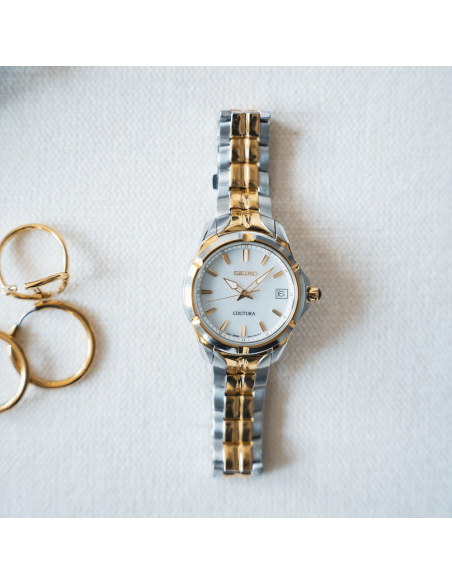 Ceas de mana dama Seiko Coutura SUR589, este un ceas quartz made in Japan de 34mm, vine cu un bezel cu 72 diamante, geam safir cristal si cadran sidef roz, cu mecanism japonez 6N42.