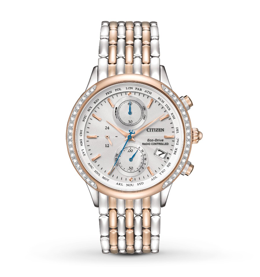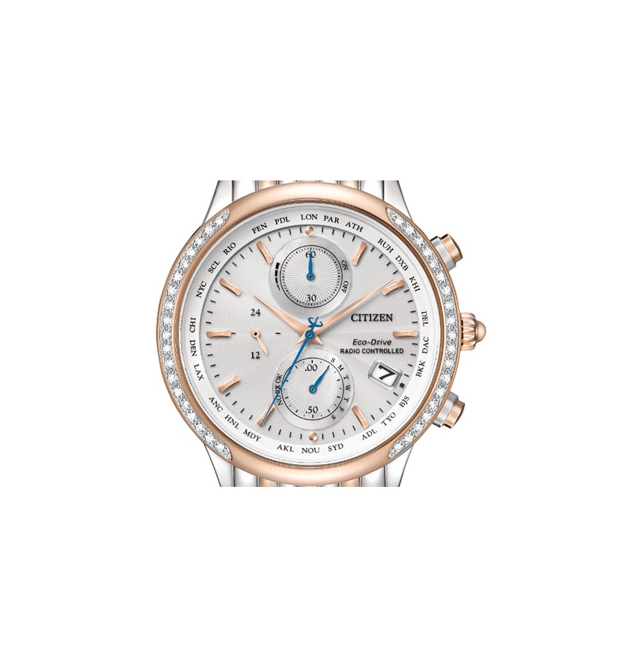 Ceasul FC5006-55A marca Citizen, este un model ce va permite orice calatorie in strainatate, beneficiind de sistem atomic de reglare a orei. Ceasul are o carcasa in doua tonuri de culoare roz-auriu si argintiu, cu insertii de diamante pe margine, functie de cronograf de pana la 60 de minute, calendar perpetuu, format al ore 12/24, zi si data.