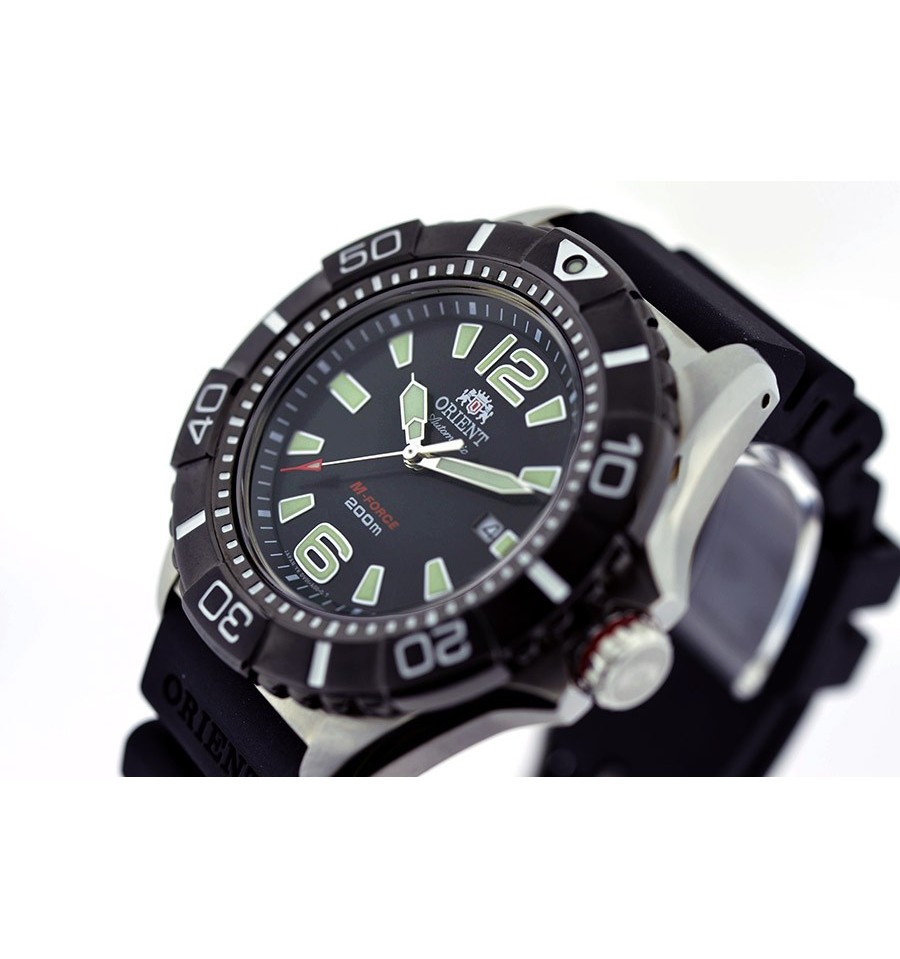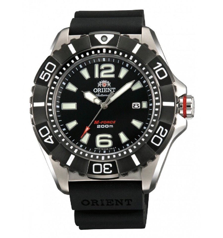 Ceas de mana barbatesc Orient M-Force SDV01003B0 este uin ceas diver de scufundari de 47mm cu o structura care permite absorbtia socurilor. Vine cu geam safir cristal si carcasa si bratara sunt din titan.