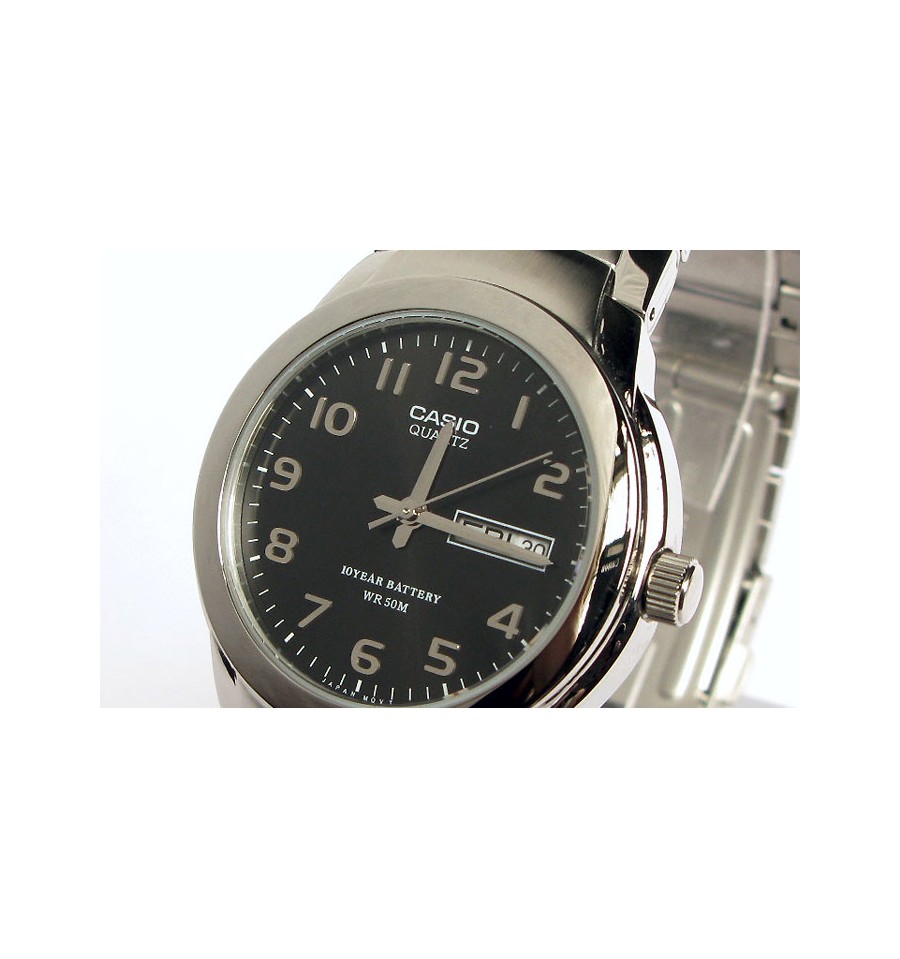 Ceas de mana Casio MTP-1229D-1A, are carcasa si bratara din otel inoxidabil argintiu,cadranul negru si indicator de zi si data., iar geamul din cristal mineral. Mecanismul ceasului este pe baza de quartz.