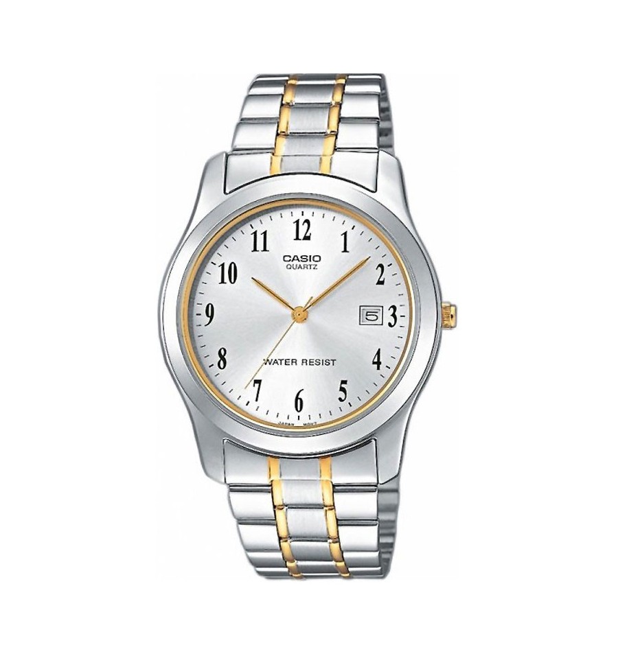 Ceas de mana Casio Clasic MTP-1264PG-7B, are carcasa si bratara din otel inoxidabil in doua tonuri,auriu si argintiu,cadranul alb si indicator de data, iar geamul din cristal mineral. Mecanismul ceasului este pe baza de quartz cu baterie.