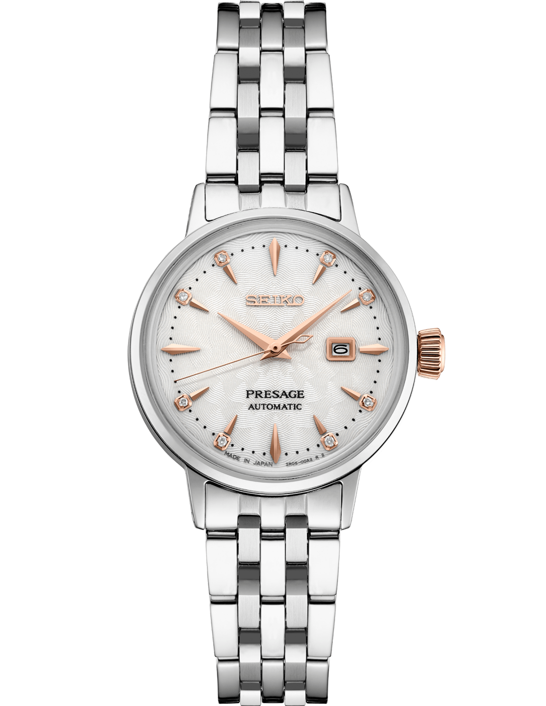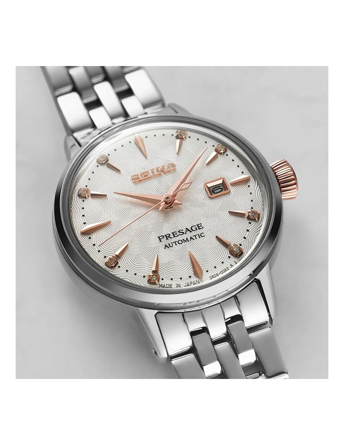Seiko Presage Cocktail Time. Oferind cele mai bune produse din ceasornicaria mecanică japoneză, colecția Presage îmbină tehnologia de precizie cu măiestria și designul superioare. Inspirate de vibrația cluburilor moderne ale orașului, cele mai noi modele Cocktail Time exprimă entuziasmul orasului Tokyo, cu stil și culori proaspete. Cu 8 diamante care adaugă strălucire unui cadran alb cu model presat, finisaj lucios și accente de aur roz, acest ceas rafinat evocă cocktail-ul Clover Club. Elegantă carcasa grațiosa si subțire găzduiește noua mișcare mecanică automată, de calibrul 2R05 de 21 de rubine, noua, mai subțire, care bate la o frecvență de 21.600 de vibrații pe oră, cu o rezervă de putere de aproximativ 41 de ore și capacitate de incarcare manuală. Brățara frumos conică, cu cinci rânduri, are un finisaj în oglindă pentru o strălucire suplimentară. Fabricat din oțel inoxidabil, cu calendar cu dată, cristal în formă de cutie, spate infiletat și închidere/deschidere cu buton de eliberare. 5 bari, 50M rezistent la apa