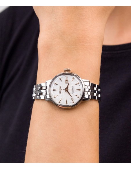 Ceas de mana dama Seiko Presage Cocktail Time automatic SRE007 SRE007J1 cu 8 diamante, este un ceas automatic si mecanic calibru 2R05 made in Japan de 30.3mm, geam Hardlex cristal.