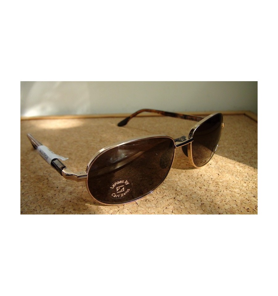 Aceasta pereche de ochelari de soare, MB 521 03, produsa de renumitul Mercerdes Benz, are lentile Carl Zeiss de culoaremaro si rama din metal auriu si plastic maro. Ochelarii sunt produsi in Italia si sunt 100% U.V.