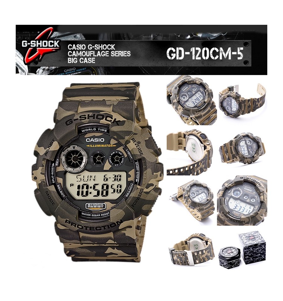 Ceas de mana barbatesc Casio G-Shock Camuflaj GD-120CM-5ER, produs de renumitul Casio, are carcasa si cureaua din resin negru, afisajul si este rezistent la socuri puternice.